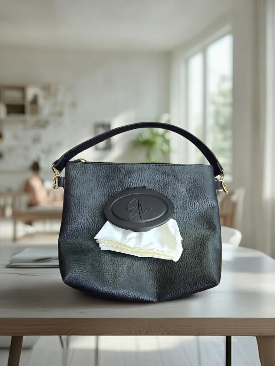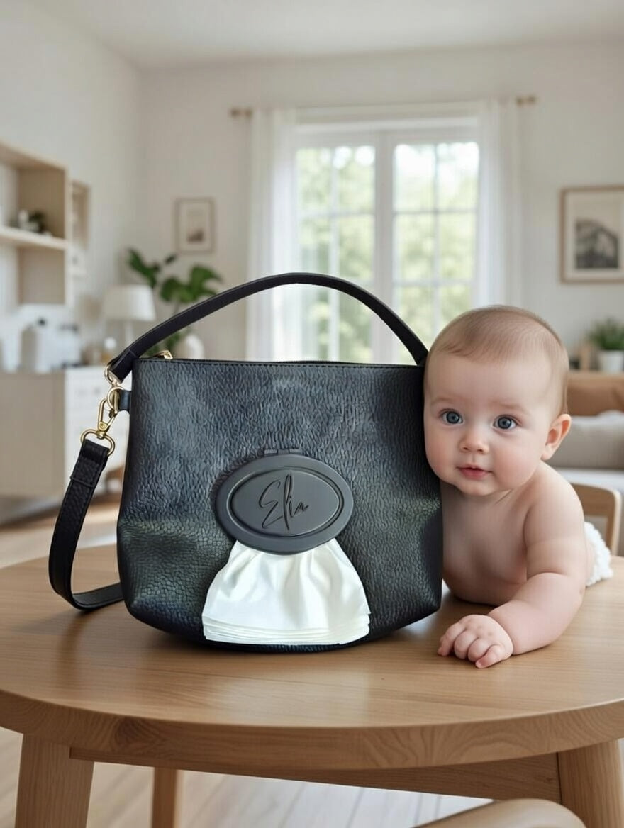 Islak mendilleri toplu olarak satın alabilir ve çantanın ön kısmında yer alan yeniden doldurulabilir ıslak mendil haznesine kolayca yerleştirebilirsiniz. Böylece ayrı bir ıslak mendil paketi taşımanıza gerek kalmaz.